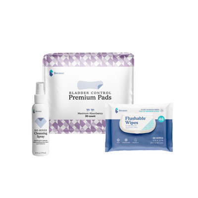 Don't let bladder leaks keep you from staying active. Our Stay Active Bundle includes maximum pads that absorb up to 2 cups of liquid to keep you dry through your workout. Freshen up post-workout with our flushable wipes and no-rinse spray.
